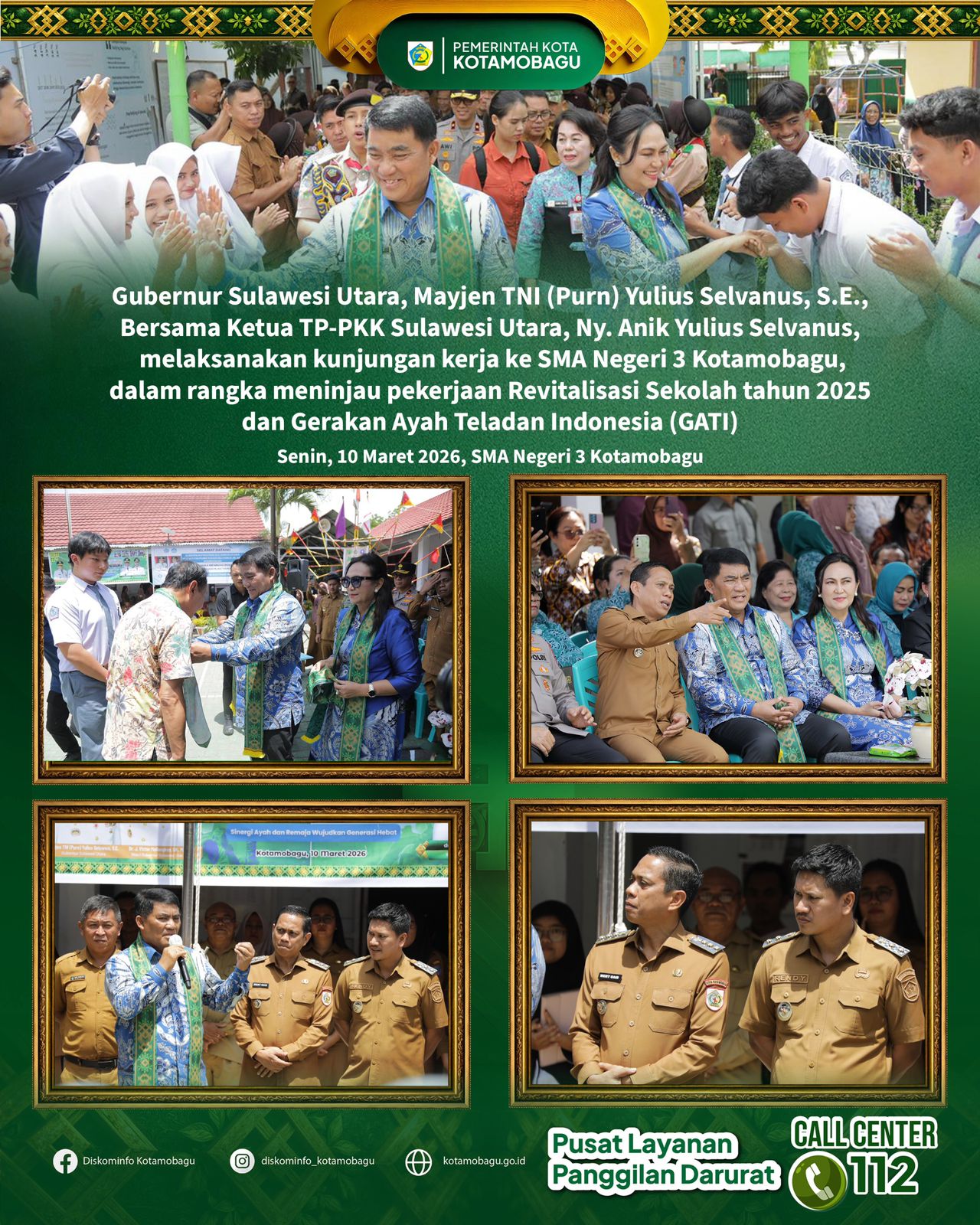 Kedatangan Gubernur Sulawesi Utara beserta rombongan disambut antusias oleh ratusan siswa dan tenaga pendidik di SMA Negeri 3 Kotamobagu. Suasana penyambutan berlangsung meriah dengan semangat para pelajar yang ingin bertemu langsung dengan Gubernur Sulut.