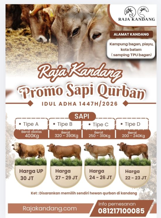 Untuk itu, MetroBatam memberikan salah satu rekomendasi lokasi pembelian hewan kurban di Kota Batam, Kepulauan Riau (Kepri) yang dapat Anda pertimbangkan ataupun yang masih mencari-cari lokasi beli hewan kurban.