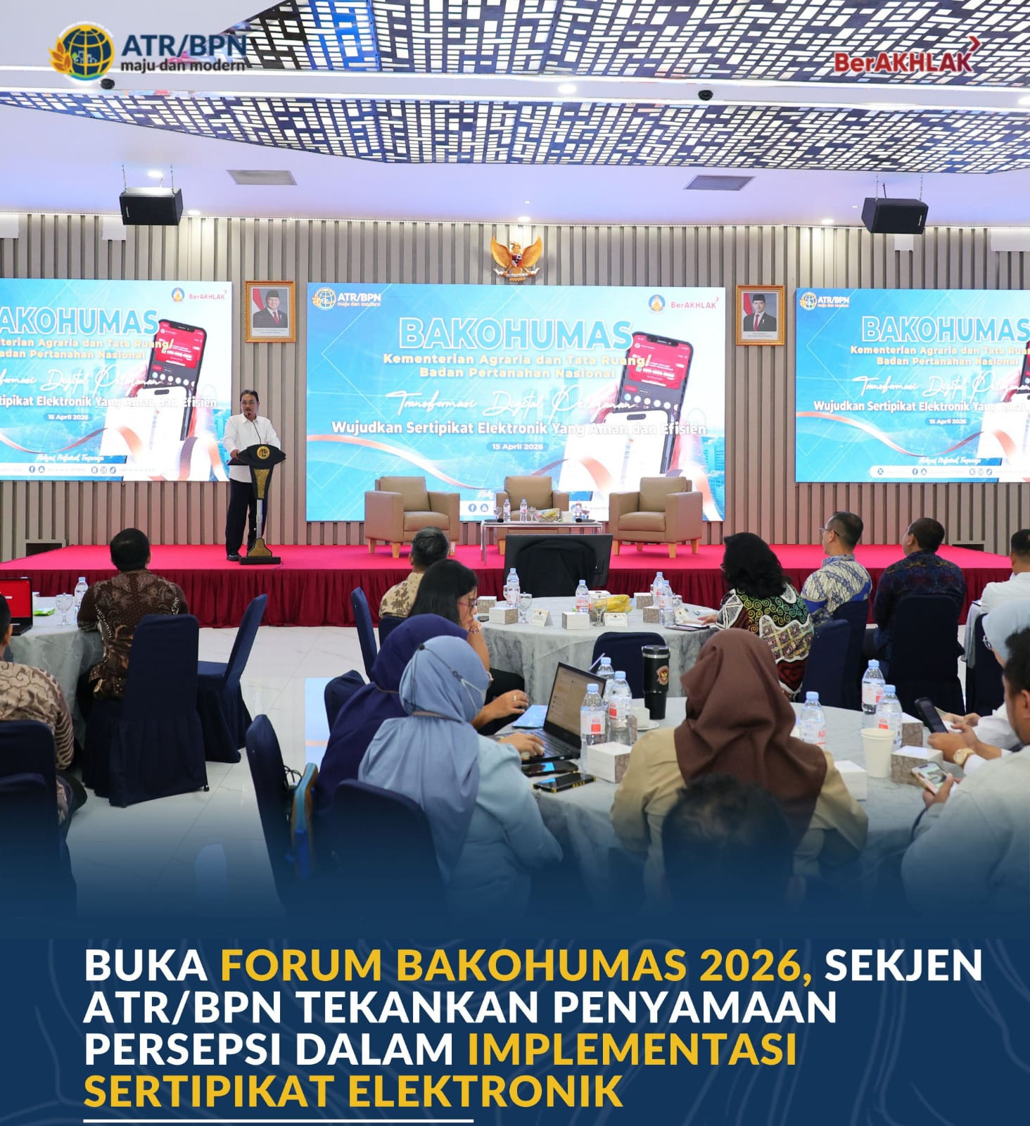 Di hadapan peserta Bakohumas yang terdiri dari 100 humas kementerian/lembaga, Sekjen ATR/BPN menjelaskan bahwa Sertipikat Elektronik itu sendiri telah dicanangkan sejak 2023. Transformasi ini jadi langkah pemerintah menghadirkan layanan publik yang lebih modern, transparan, dan berbasis teknologi.