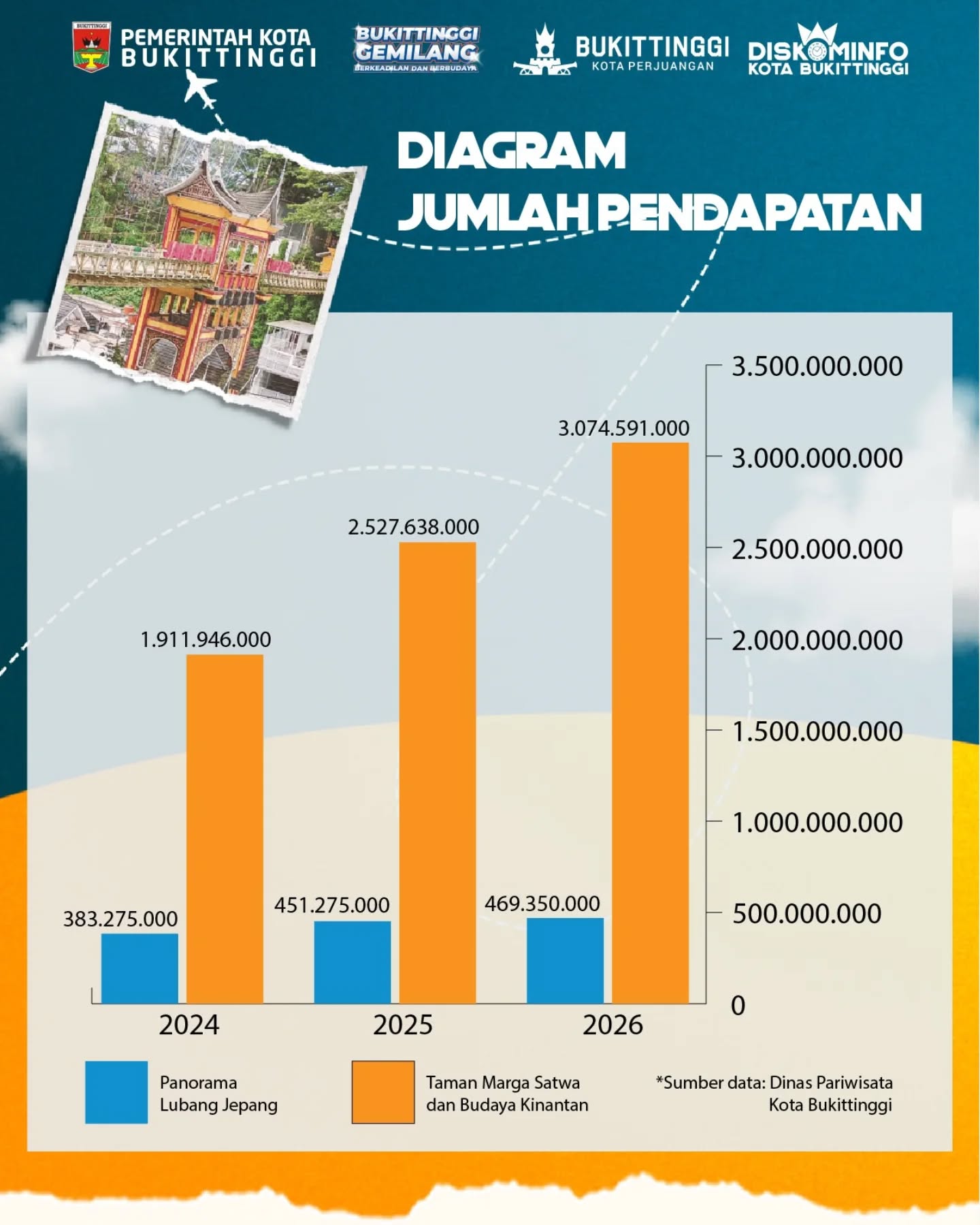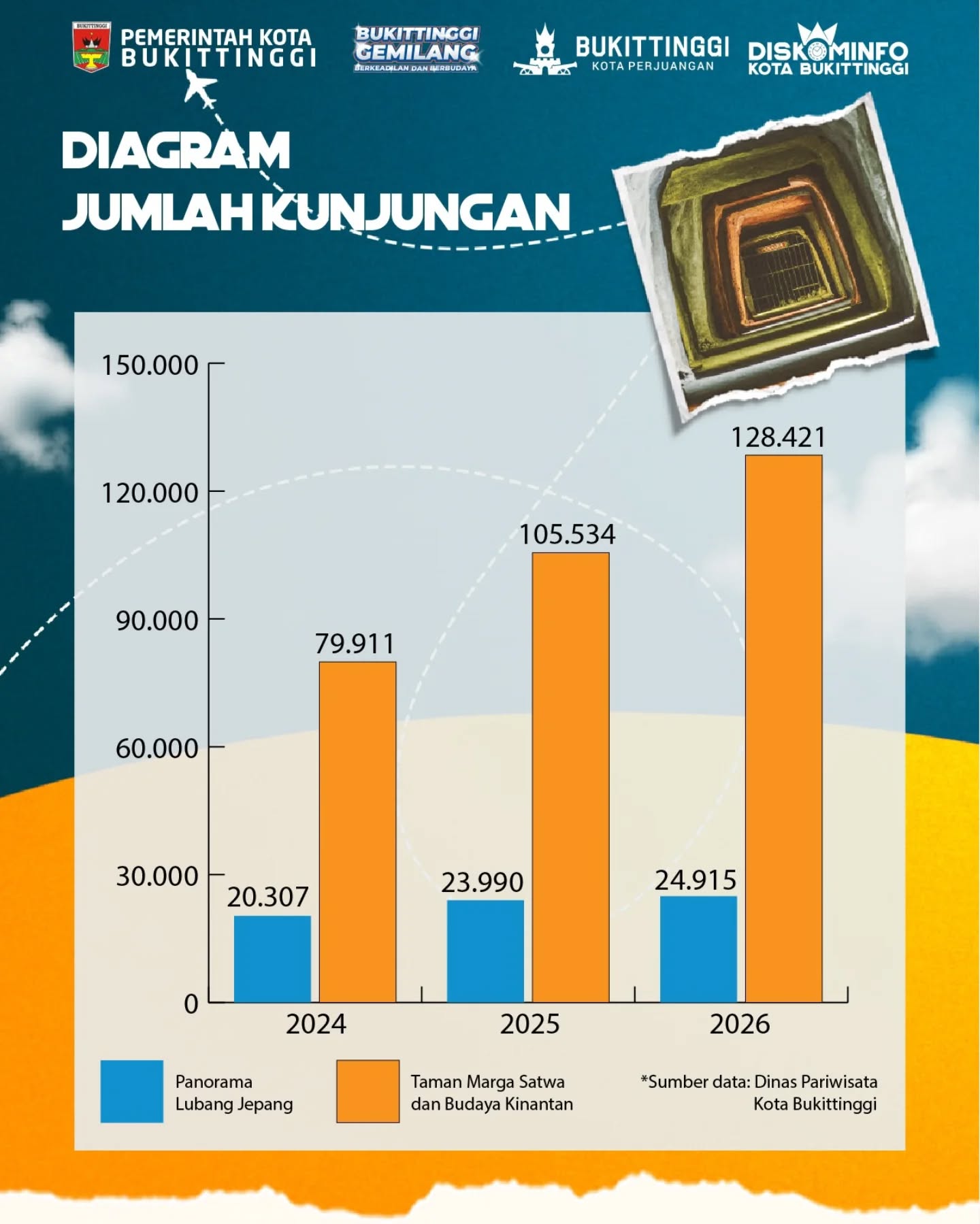 Berdasarkan data Dinas Pariwisata, sebanyak 153.326 wisatawan mengunjungi berbagai destinasi wisata berbayar di Kota Bukittinggi selama libur Lebaran Idul Fitri 1447 Hijriah atau tahun 2026. Dari jumlah tersebut, Pemko Bukittinggi berhasil meraup PAD sebesar Rp3.543.941.000.