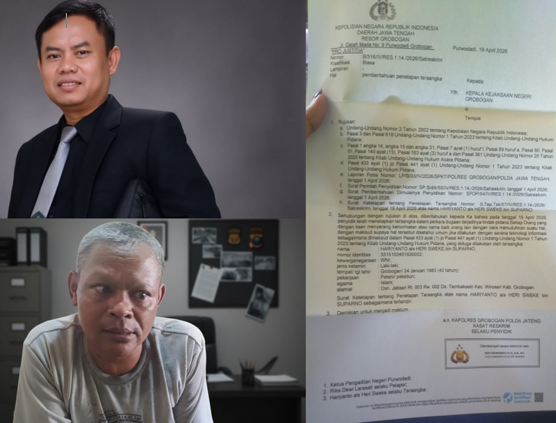 “Benar kami telah menerima pemberitahuan tentang penetapan tersangka Heri Sweke melalui surat yang dikirim oleh Satreskrim Polres Grobogan. Dan saya rasa penetapan tersangka Heri Sweke ini sangatlah layak karena dari alat bukti, keterangan saksi-saksi semua mendukung,” ujar Minarno Tirta, S.H, M.H. Senin (20/04/2026).