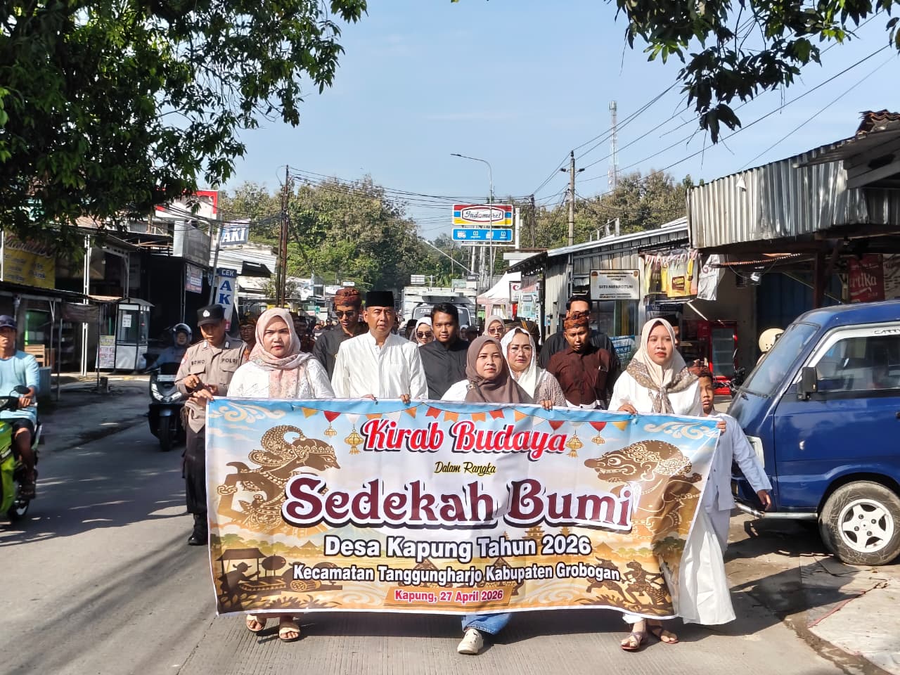 Metrobatam.com, Grobogan— Pemerintah Desa Kapung, Kecamatan Tanggungharjo, Kabupaten Grobogan, kembali menunjukkan komitmennya dalam menjaga warisan budaya dengan menggelar tradisi tahunan Sedekah Bumi (Merki Deso), Senin (27/4/2026). Di tengah derasnya arus modernisasi, tradisi ini tetap berlangsung meriah dengan semangat kebersamaan warga.