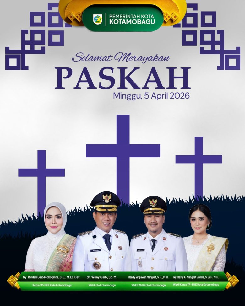 Dengan penuh sukacita, Pemerintah Kota Kotamobagu mengucapkan Selamat Hari Paskah 2026. Semoga damai dan kasih senantiasa menyertai seluruh masyarakat. (W)
