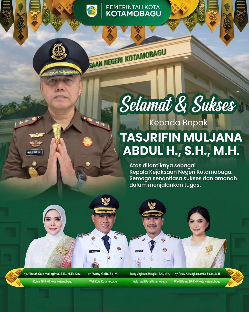 Dalam sambutannya, Weny Gaib menyampaikan ucapan selamat datang kepada Kepala Kejaksaan Negeri yang baru. Ia mewakili kepala daerah se-Bolaang Mongondow Raya dan seluruh masyarakat menyambut kehadiran Tasjrifin Muljana Abdul beserta keluarga.