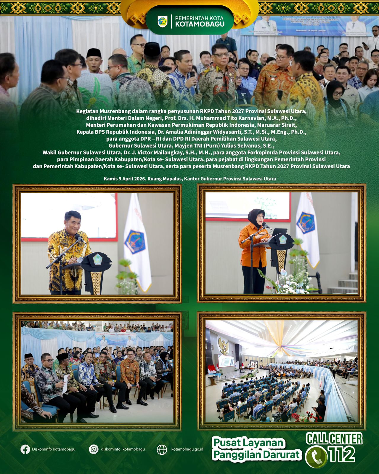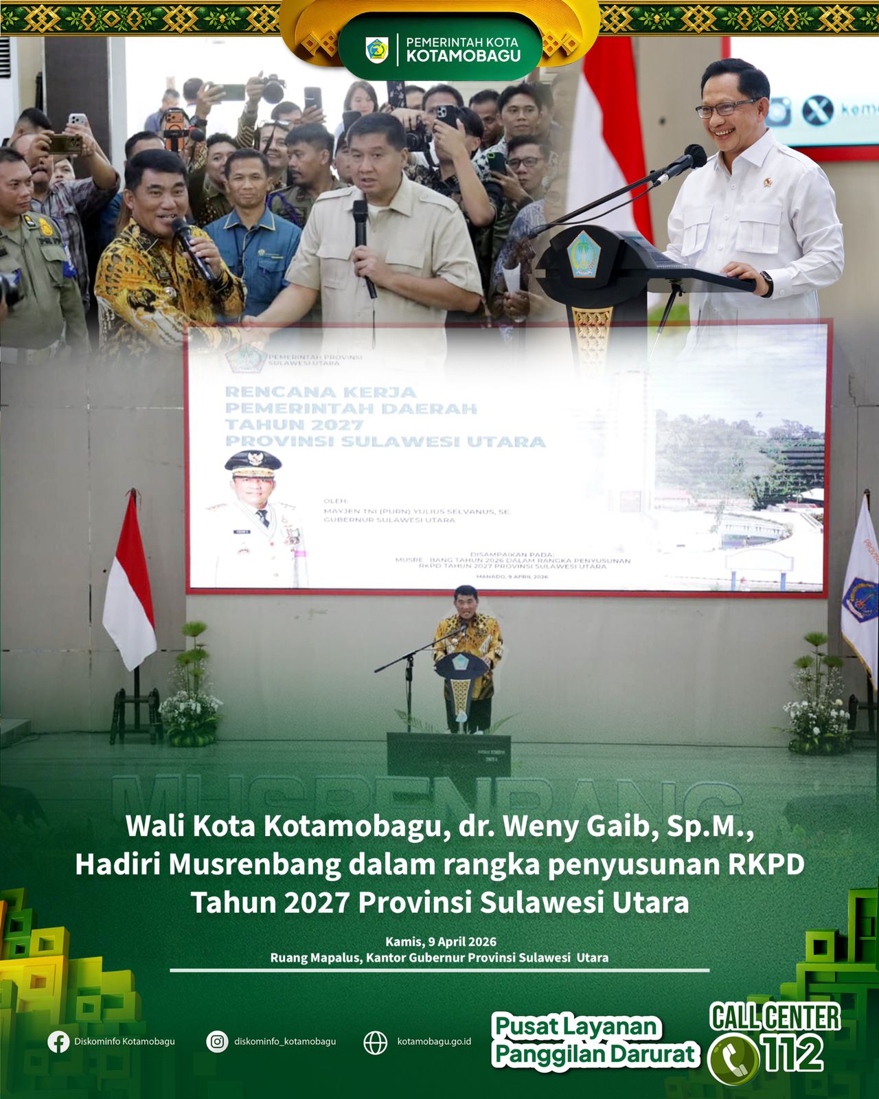 Metrobatam.com, Kotamobagu – Wali kota Kotamobagu Dr. Weny Gaib,.SpM., menghadiri Musyawarah Perencanaan Pembangunan (Musrenbang) tingkat Provinsi Sulawesi Utara dalam rangka penyusunan Rencana Kerja Pemerintah Daerah (RKPD) Tahun 2027, Kamis (9/4/2026).
